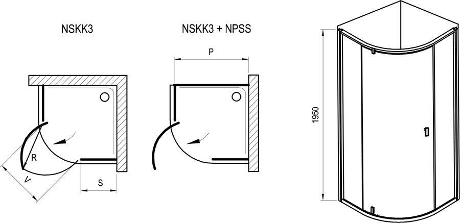 A terméket két egyenes fix részből és egy íves nyíló elemből áll, amely a termék ajtaját képezi. A termék 180°-os megfordításával választhatunk a balos vagy jobbos változat között.