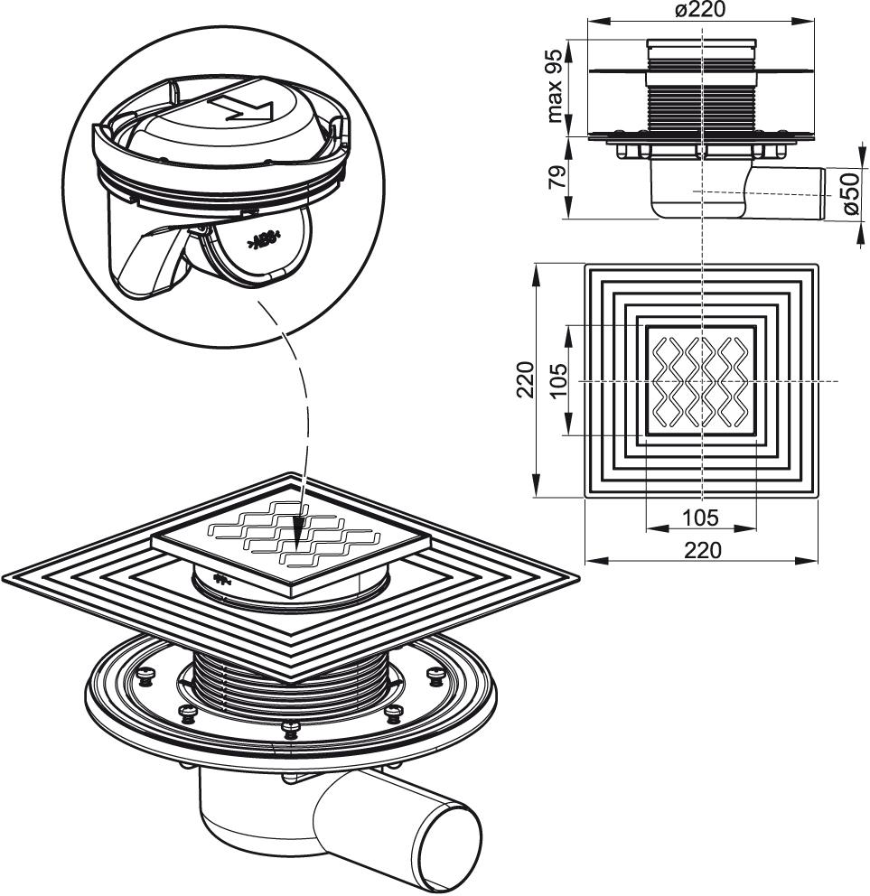 ALCA (Alcaplast) APV2324 Padlóösszefolyó 105×105/50/75 mm függőleges, rozsdamentes rács, rozsdamentes szigetelés rögzítő, karima a 2.szintű szigeteléshez, kombinált SMART bűzzár