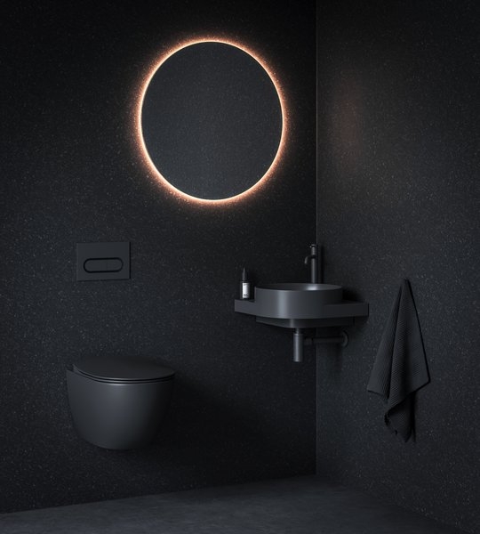 A kör alakú sarok mosdót egy fehér, fekete vagy rozsdamentes acél kivitelű, dizájner elem egészíti ki, rögzítőkonzol formájában. A konzol, a mosdócsaptelep, a szifon és a lefolyó összhangja az elegancia varázsát hozza el fürdőszobájába.