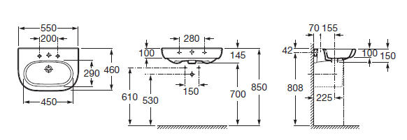 Roca Meridian 55x46 cm-es fali mosdó 7327243000 Porcelán Csapnyílás-kiosztás: 1 kikönnyített, 1 csaplyuk, 1 kikönnyített Méretek: Hosszúság: 550 mm. Szélesség: 460 mm. Magasság: 150 mm. Opcionális Szifontakaró 7337241000 Mosdóláb 7337240000
