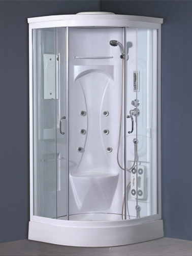 Sanimix 22.8023 negyedköríves hidromasszázs zuhanykabin Akril hátfalas hidromasszázs zuhanykabin 90x90x215 Cikkszám : 22.8023 Leírás : Negyedköríves hidromasszázs zuhanykabin elektronikával 90x90x222 cm Mattkróm profilok Átlátszó, 5 mm biztonsági üveg Üvegszál erősítéses, acél merevítésű, fehér színű, alacsony, akril, zuhanytálca, állítható fém lábakkal 1 részes akril hátfal beépített ülőkével és polcokkal 6 masszírozó jet Vezérlőpanel Rádió Ventillátor Felső világítás Kézi zuhany Felső esőztető zuhany Kerámia betétes keverőszelep és funkcióváltó Lábmasszázs Tükör Mágneszár Leeresztő szelep Görgős ajtónyitás