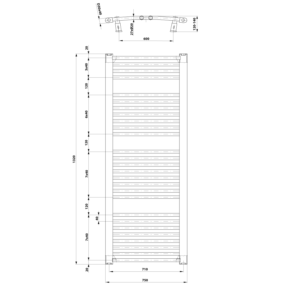 Radeco Dora AD2-600/P D profilos egyenes típusú törölközőszárítós csőradiátor (495 W, fehér, 680x650 mm)