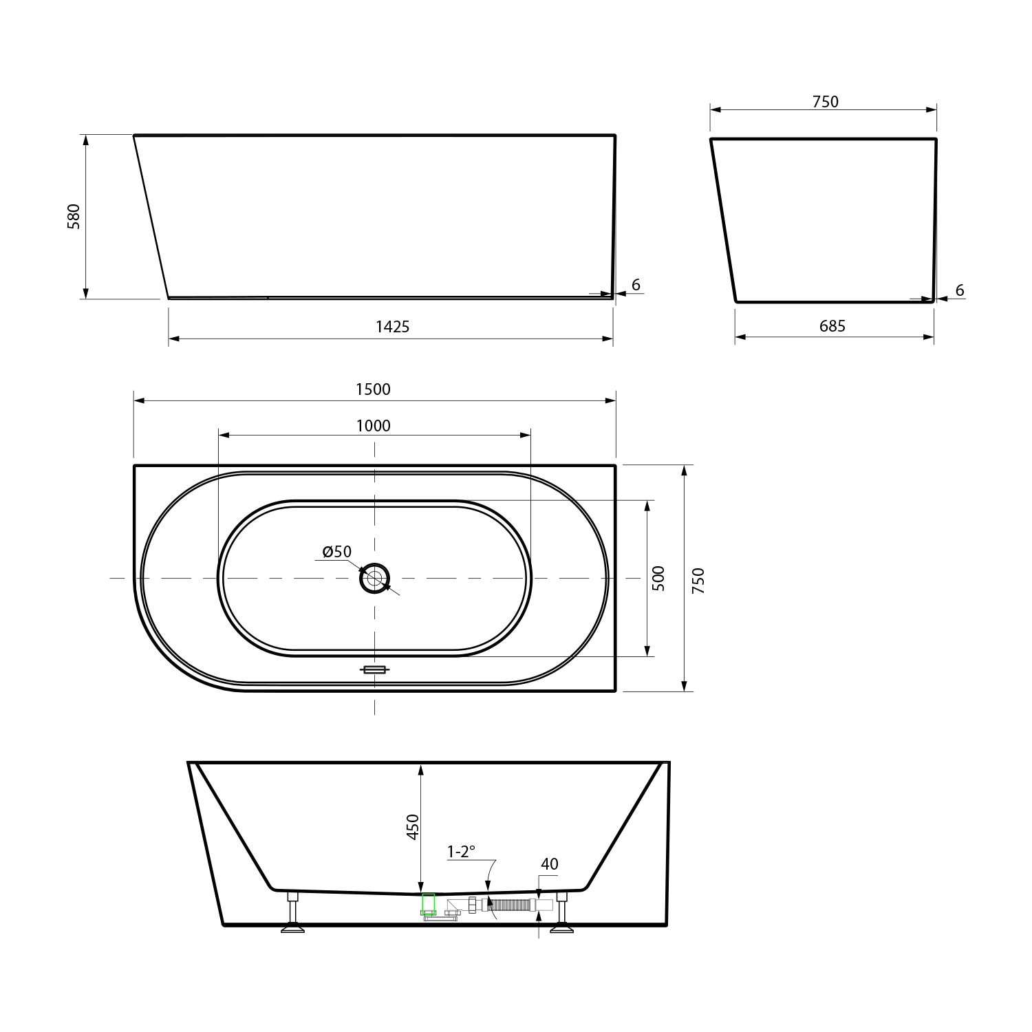 Sapho AQUALINE TIBERA L 150x75 cm balos szabadon álló akril kád, fehér E1047