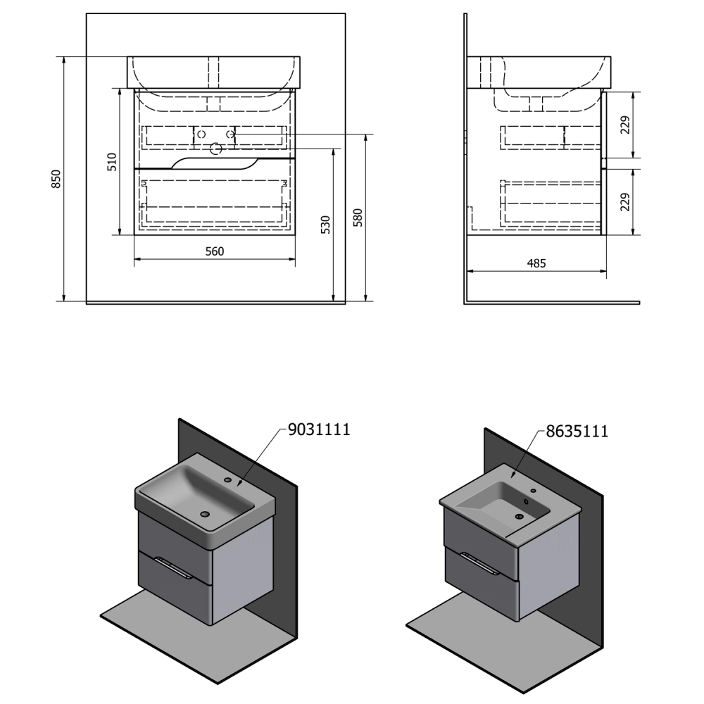 Marmy CODE 90x46x50 függesztett alsószekrény, 2 fiók, laminált (mosdó nélkül) Dark Taupe 20 20 22 09 00 74