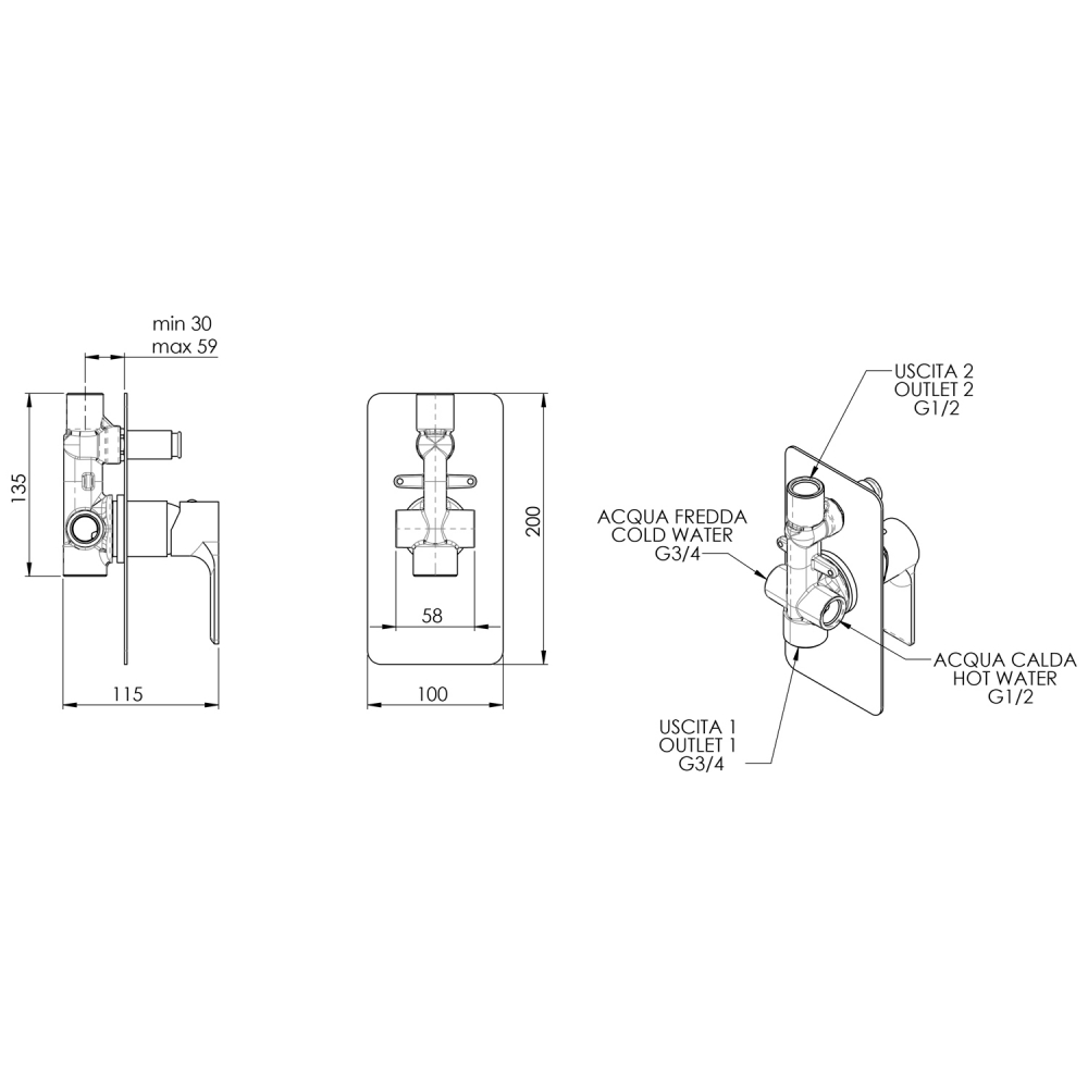 Sapho ULTRASAN 2-irányú falba süllyesztett csaptelep, matt fekete/króm UT042VBC