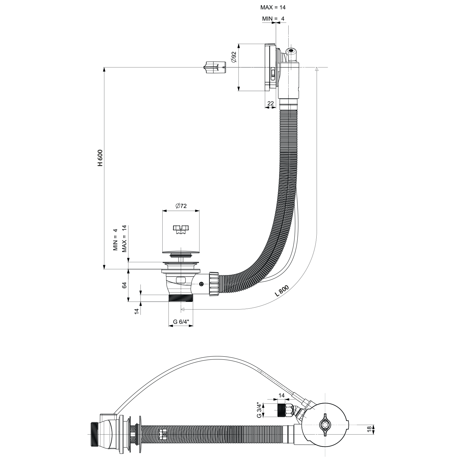 Sapho POLYSAN 80 cm bovdenes lefolyó kádtöltővel, matt fekete 71853.21Polysan