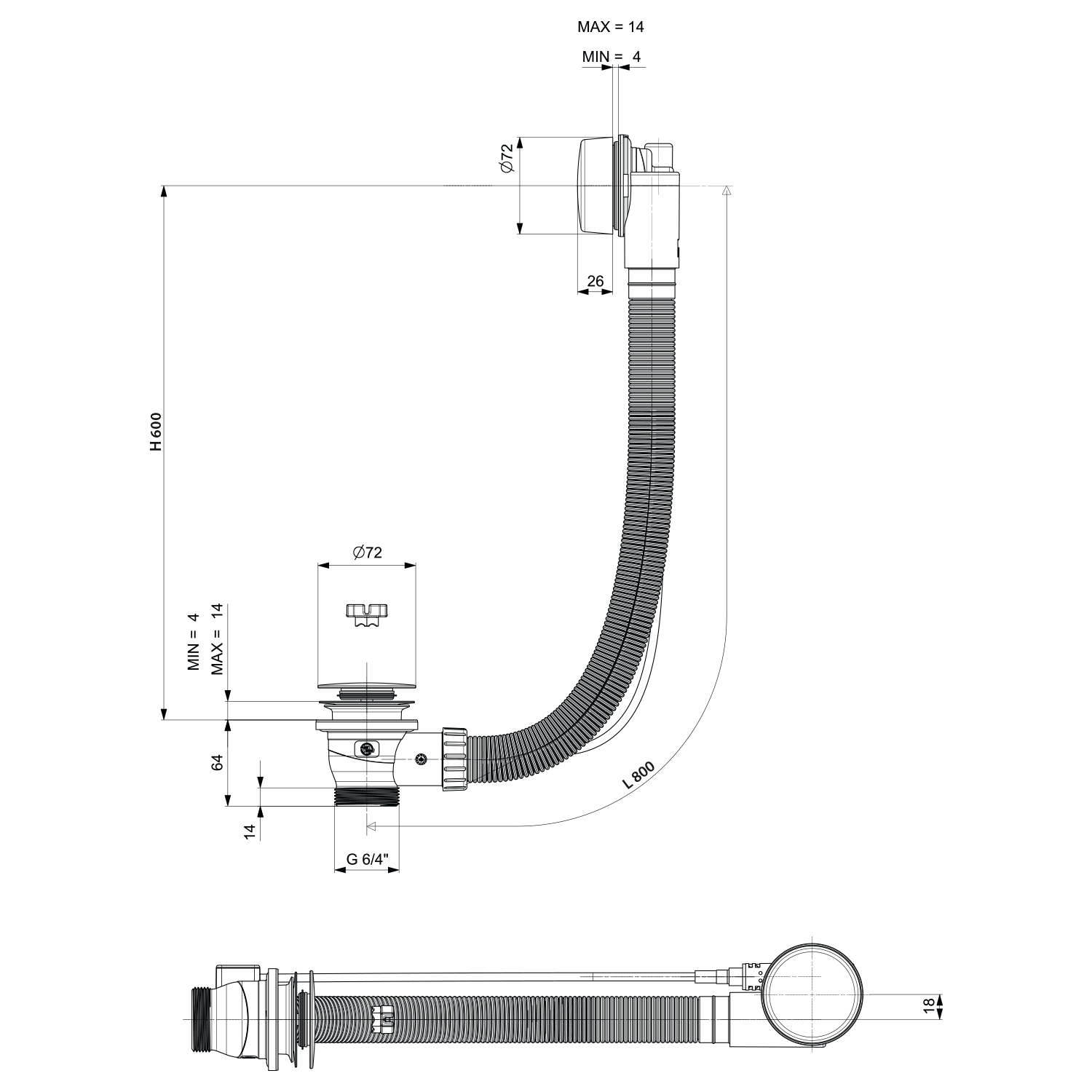 Sapho POLYSAN 800 mm bovdenes kád le- és túlfolyó, matt fekete 71852.21Polysan