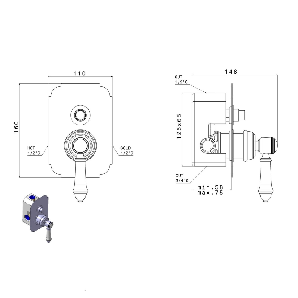 Sapho VIENNA falba süllyesztett zuhanycsaptelep, 2-irányú váltóval, zuhanyszett nélkül, króm (VO042) Kosárba +