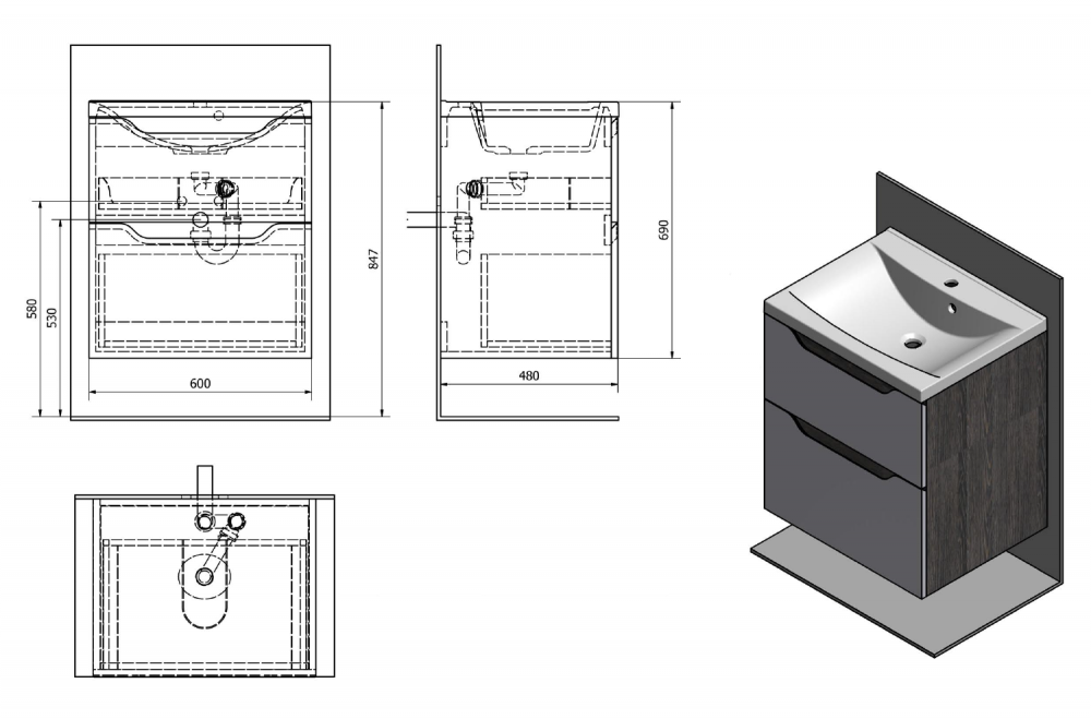 Marmy CODE 60x46x50 függesztett alsószekrény, 2 fiók, laminált (mosdó nélkül) Dark Taupe 20 20 22 06 00 74