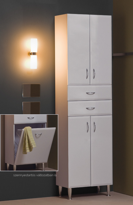 Tboss Bianka M53 fürdőszobai zárt álló szekrény szennyestartóval Fóliázott MDF Láb: króm pezsgő Foganytú: króm íves Jobbos vagy balos ajtónyitási irány Magasság: 1920 mm Szélesség: 530 mm Mélység: 300 mm Alapszínek: fóliázott MDF magasfényű fehér, erezett fehér, körte, juhar, bükk, cseresznye, calvados, szilva, dió, venge, tölgy Extra színek: Alapszínes ár +15% Színminta üzletünkben megtekinthető!