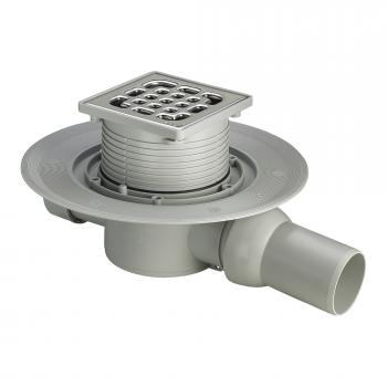ALCA (Alcaplast) APV1324 Padlóösszefolyó 105×105/50/75 mm vízszintes, rozsdamentes rács, rozsdamentes szigetelés rögzítő, karima a 2. szintű szigeteléshez, kombinált SMART bűzzár